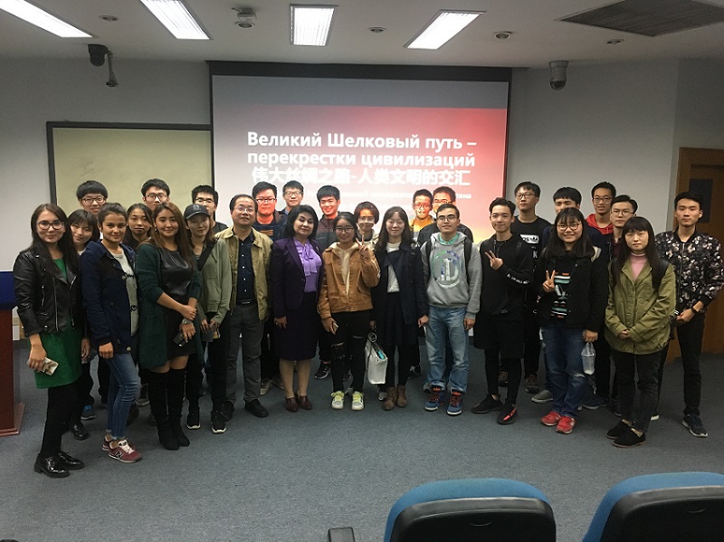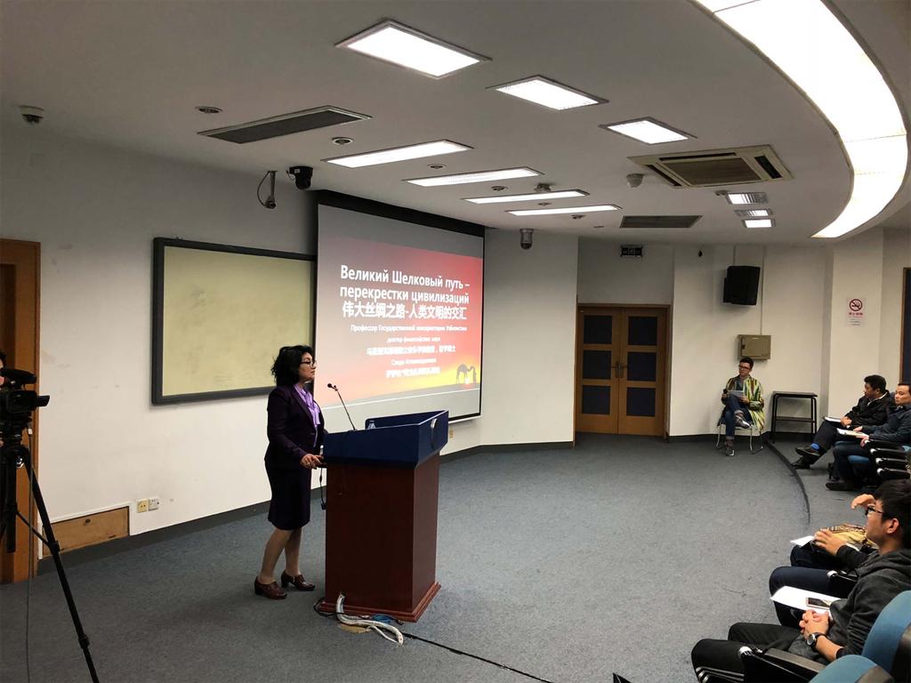 11月7日晚, 受校国际事务处“一带一路”专项行动计划的邀请,乌兹别克斯坦国立音乐学院教授萨伊达·阿戈扎姆霍德热耶娃(Saida Agzamkhodjaeva)走进宝山校区J102教室。上合组织公共外交研究院与社科学部马克思主义学院联袂通过第52期公共外交与全球治理沙龙平台,为《大国方略》课学生带来“伟大的丝绸之路与人类文明的交汇” (Великий шелковый путь-перекрестки цивилизаций)的精彩报告。