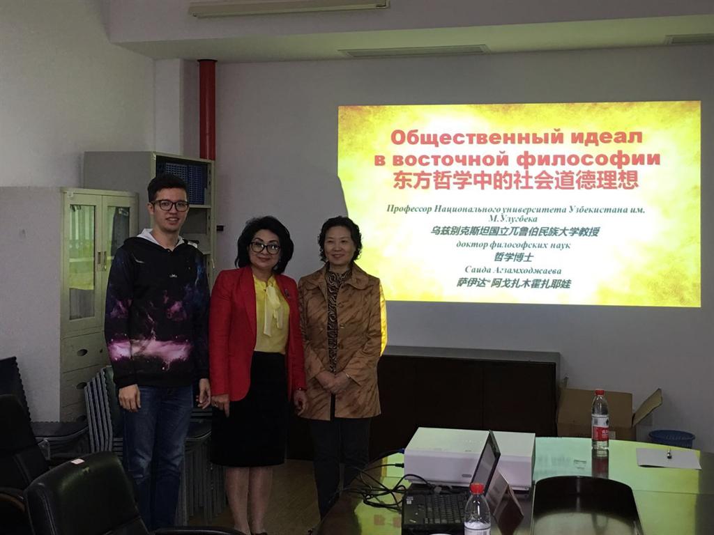 萨伊达教授以中国古代圣贤为例介绍自己对于哲学的独特思考引发了同学们的极大兴趣,讲座氛围活跃,讨论热烈。宁莉娜教授最后向萨伊达教授提问:乌兹别克斯坦哲学研究的新方向。萨伊达教授表示,乌国正处于建设现代民主社会的转型时期,东方哲学和德国哲学都是学界关注的领域,东方智慧决定着乌国必须选择构建适合自己历史文化传统的道路。通过此次讲座,使同学们对东方哲学中的社会道德理想有了不同理解视角,而且使同学们了解到乌兹别克斯坦的人文风情。