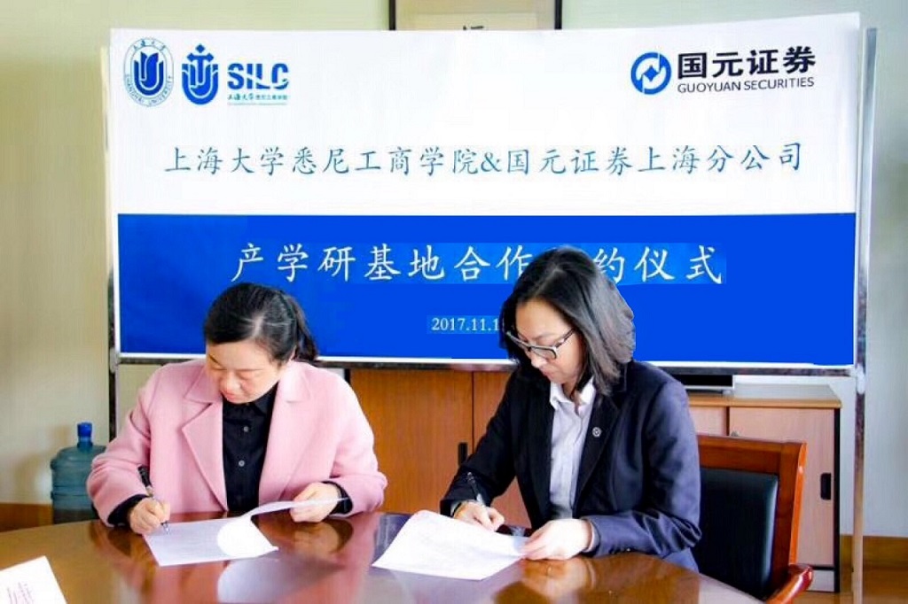 悉尼工商学院与国元证券上海分公司就共建产学研基地于11月15日上午举行签约仪式。国元证券上海分公司营销管理部经理臧东东、虹桥路营业部总经理李晴、机构部经理朱海东、学院副院长方慧、经济金融系执行主任兼经济系研究生项目负责人贾利军等领导和老师出席签约仪式。