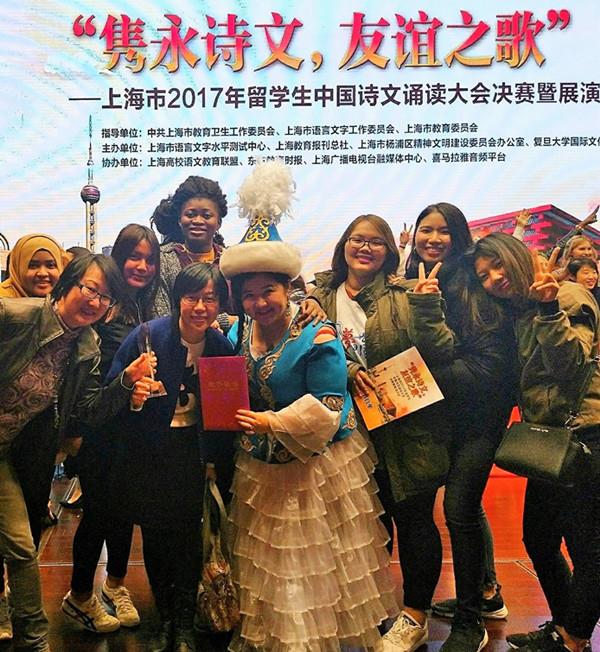 经过艰苦备战,与伴舞、伴奏不断磨合,在19日的决赛中,迪娜在激烈的竞争中脱颖而出,以其纯正的语音、声情并茂的朗诵、艺术化的表现形式,战胜了来自复旦、交大等的一众高手,喜获一等奖,展示了365英国上市官网在线留学生的语言面貌,提高了365英国上市官网在线国际教育的知名度。365英国上市官网在线国际交流学院长年为留学生开设普通话语音训练、诗文朗诵、古文选读、中国文化等语言文化类课程,相信今后还会涌现出更多的像迪娜这样的“中国通”。