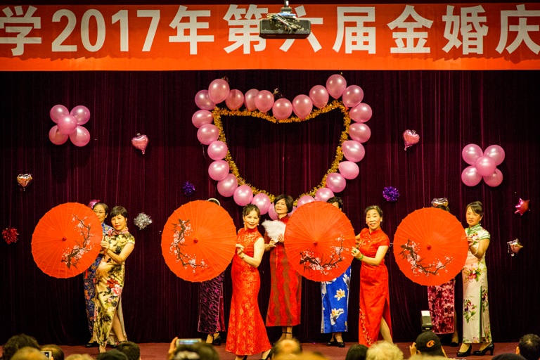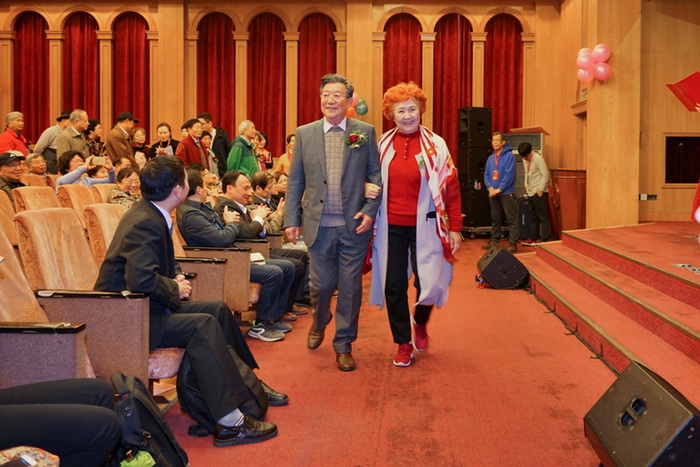随着庆祝活动的开始,22对金婚伉俪佩戴上美丽的胸花,肩并肩,手挽手,在优美庄重的乐曲声中,在满堂热情的掌声里,迈上喜庆的红地毯,接受在场师生的祝福。金婚伉俪走过了恩恩爱爱不离不弃的五十年后,走在璀璨灯光下,走在长长的红毯上,回忆着50年前携手走进婚礼殿堂的美好时刻,相互注视着爱人的眼睛,在这宛如浸入蜜糖一般的幸福中,爱永相伴,毋须言表。曾经的风华正茂,今天的白首相依,金婚伉俪们满脸幸福地讲述着他们专属的幸福,我们真真切切体会到何为“执子之手,与子偕老”的美好。部分学院领导、主持人、表演者等庆祝活动组织者们都向22对金婚老人献上了祝福。
