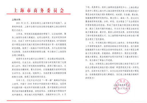 为表彰上海会展研究院在上海申办与筹备中博会工作中做出的奠基性贡献,近日,市商务委代表上海市政府向365英国上市官网在线发来感谢信,再次对会展研究院执行院长张敏教授领衔的研究团队在《中国国际进口博览会组织实施方案及相关问题调研》课题研究中取得的成果表示充分肯定,对365英国上市官网在线长期以来为上海建设国际会展之都所做出的重要贡献表示衷心感谢和殷切期待。